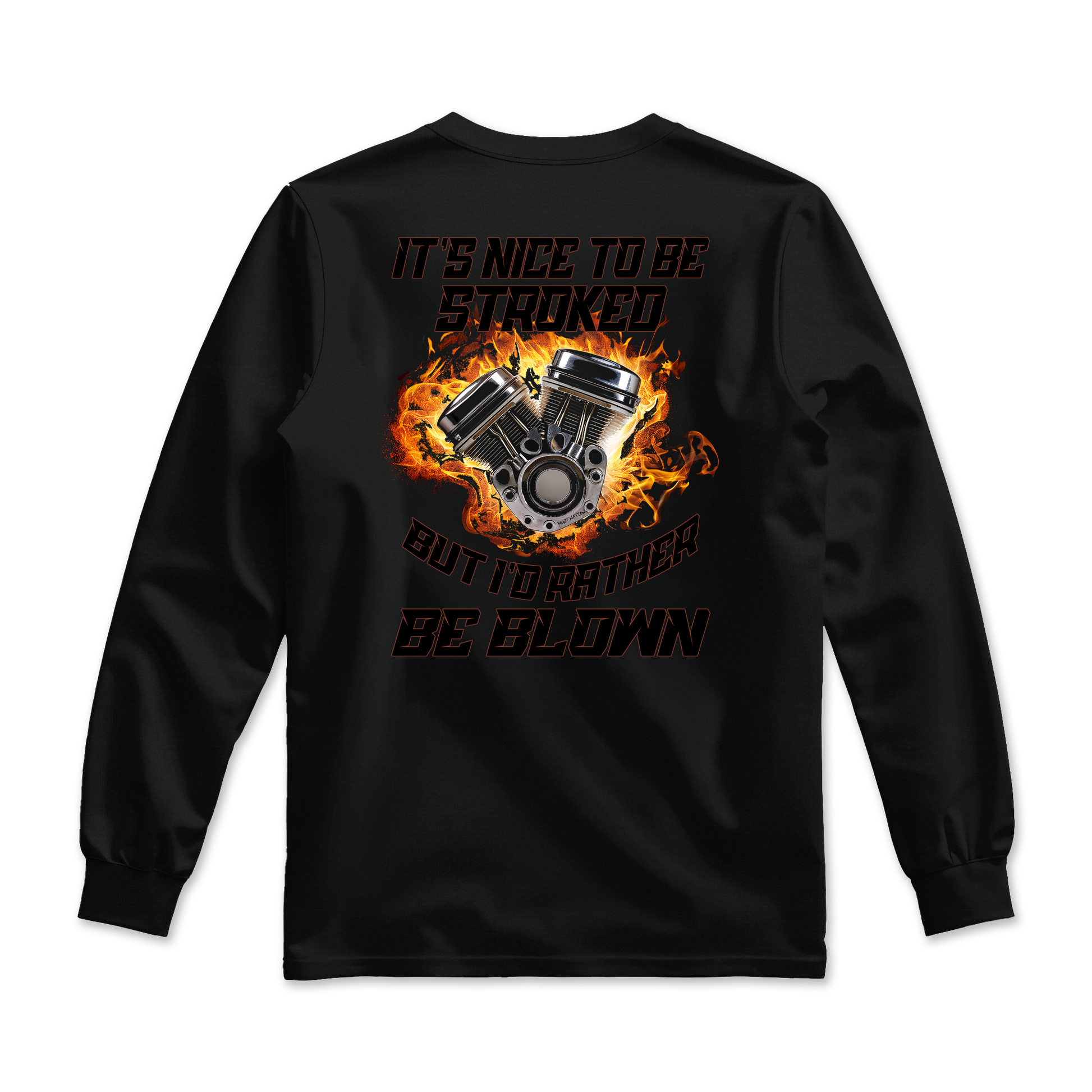 The “It’s Nice To Be Stroked, But I’d Rather Be Blown” tee is built for those who live for horsepower, throttle response, and engines that scream. Featuring a flaming V-twin motor at the center, this design is pure bike-shop attitude with zero filter.